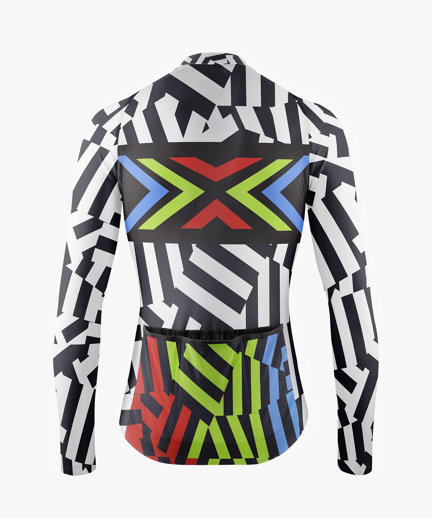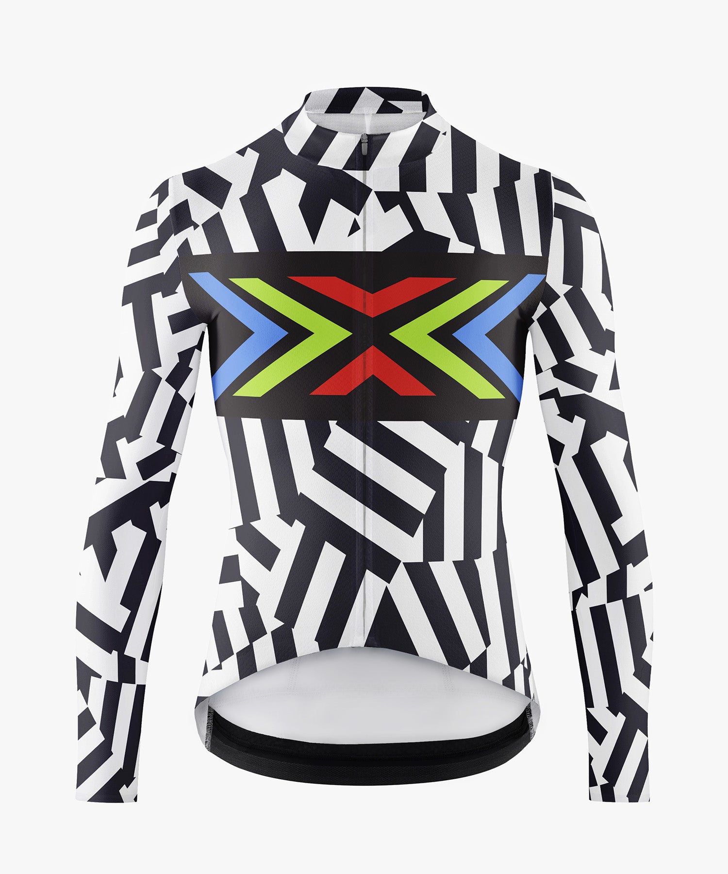 Black & white vertical stripes with a fluorescent multicolor block on the chest, creating a bold speed effect ⚡. Lightweight, breathable, perfect for dynamic riders.