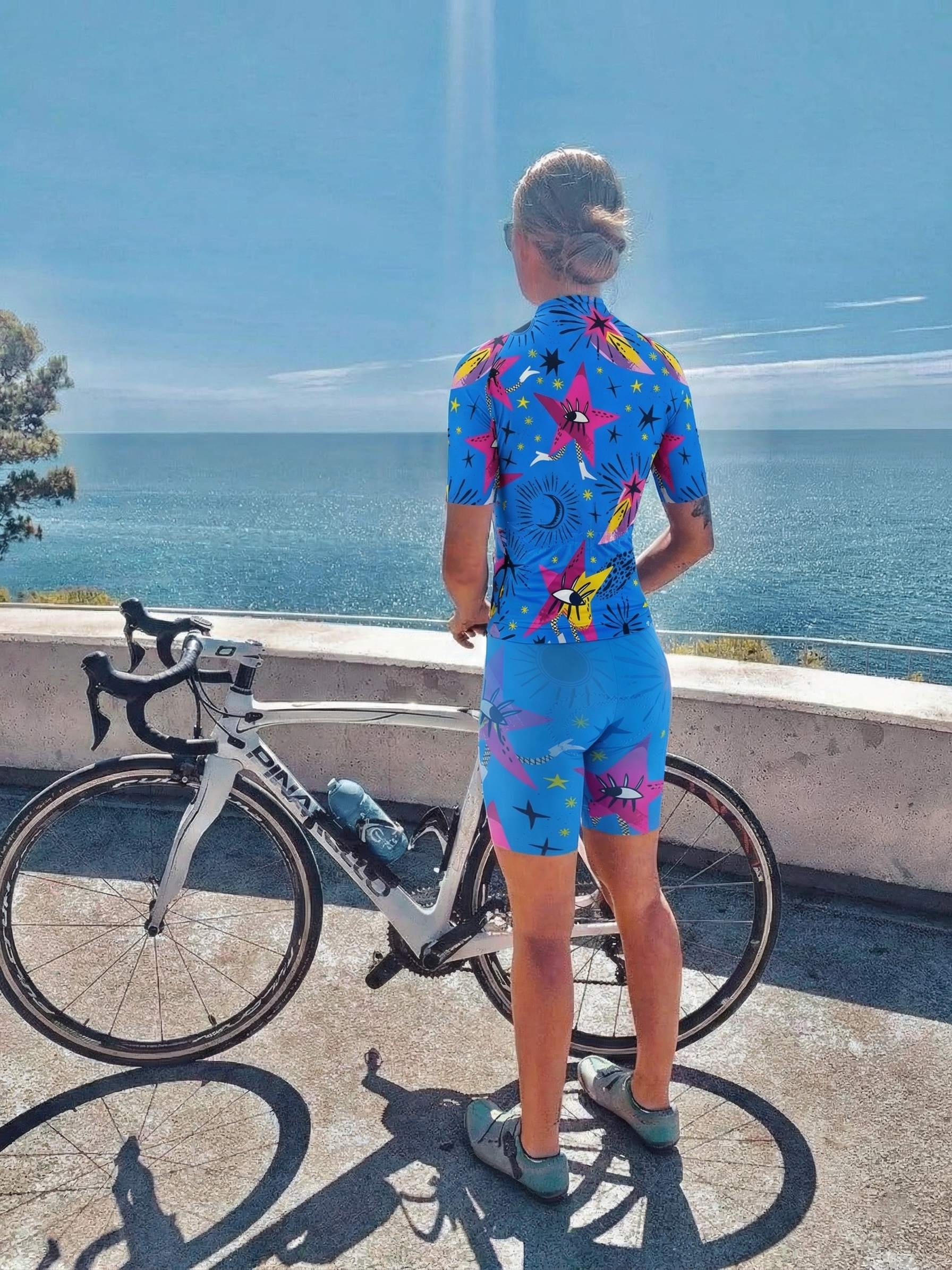 | Explore the cycling galaxy with surrealist starry-eye motifs and cosmic stardust patterns on a vibrant blue canvas. This pro-aero jersey features a streamlined fit to minimize wind resistance. The breathable, quick-dry fabric ensures superior moisture management and lasting comfort under the sun. |